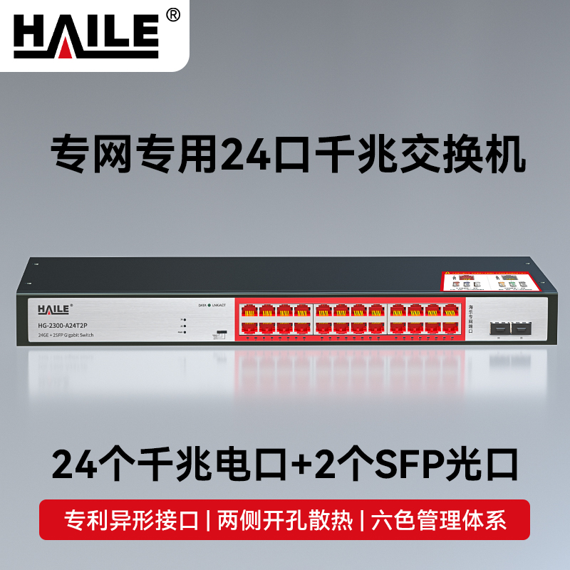 HAILE海乐内外网24口+2SFP口千兆交换机水晶头异形结构红色专网网络分流器HG-2300-A24T2P
