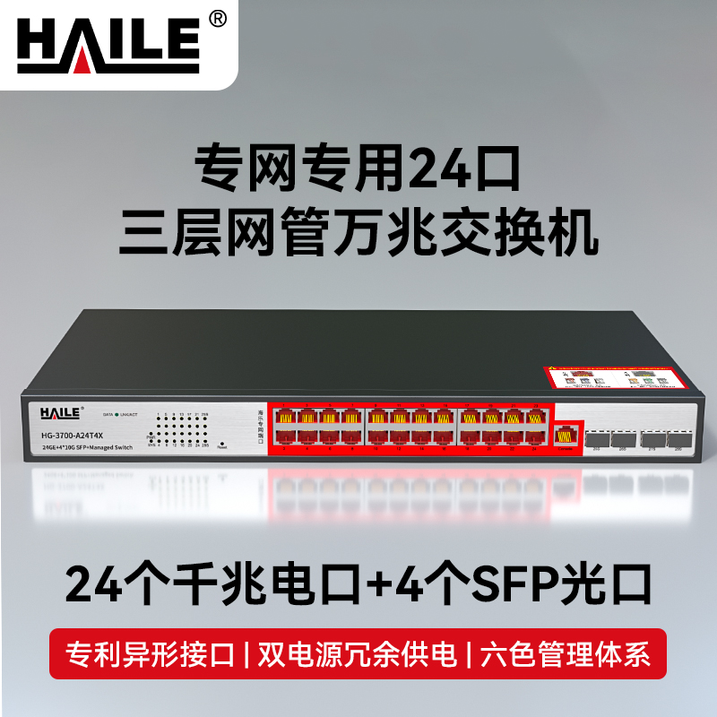 HAILE海乐内外网24口+4SFP口三层网管万兆交换机水晶头异形结构灰色专网网络分流器HG-3700-K24T4X