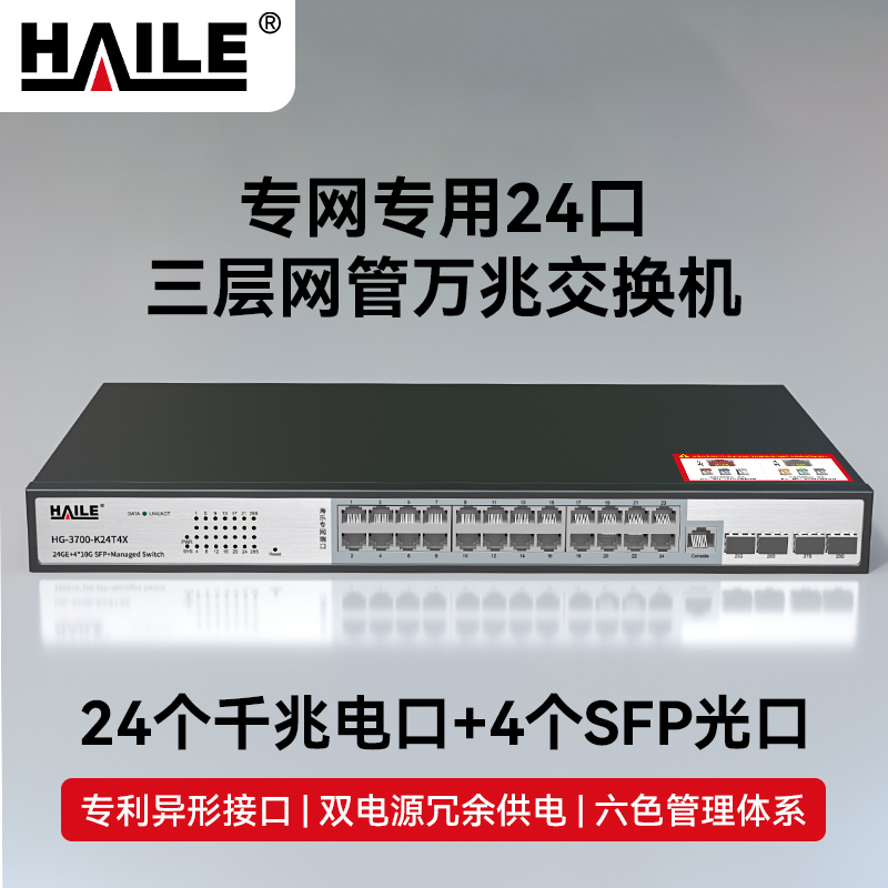 HAILE海乐内外网24口+4SFP口三层网管万兆交换机水晶头异形结构灰色专网网络分流器HG-3700-K24T4X